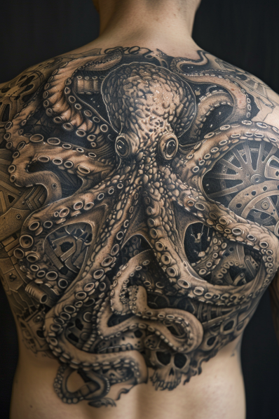 Honestly, this tattoo is just next-level. Not only is the concept of an octopus mixed with steampunk gears super cool, but the execution here is flawless. The engraving style makes every detail stand out, from the suckers on the tentacles to the intricate gears in the background. It s the perfect mix of creativity and boldness, and it covers the entire back like a wearable work of art. If you re into steampunk or just want something that screams individuality, this tattoo is a serious statement piece. Plus, an octopus with that many tentacles? That s eight times the awesomeness.