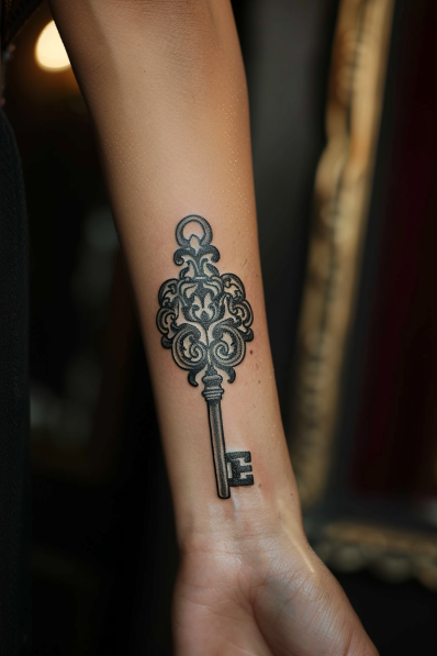 This tattoo features a strikingly detailed skeleton key, engraved with ornate patterns that give it an elegant and vintage look. The upper part of the key is intricately designed with beautiful scrollwork and flourishes, while the key s lower section remains clean and simple, creating a perfect balance between intricate and minimalistic elements. The shading adds depth, making the key look as if it s been etched into the skin, almost like an antique relic brought to life.