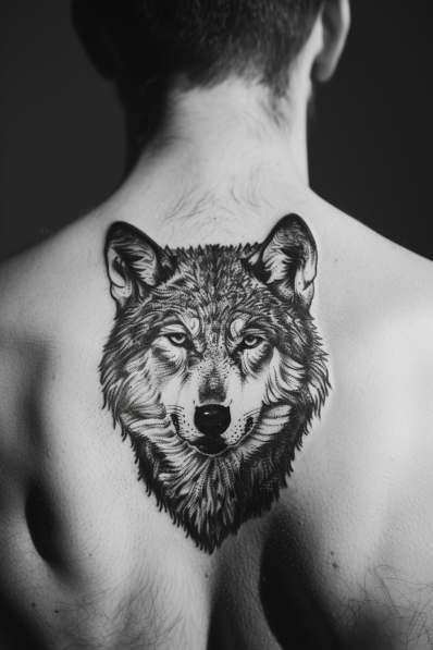 This bold wolf tattoo features an intense, highly detailed engraving-style design that captures the majestic and untamed spirit of the wolf. The tattoo showcases a frontal view of the wolf s face, perfectly positioned to look as if it s watching over the wearer s back. The shading and line work give the fur a textured, realistic feel, while the wolf s piercing eyes seem almost alive. The symmetry and attention to detail in the fur, snout, and ears create an unforgettable, striking image.