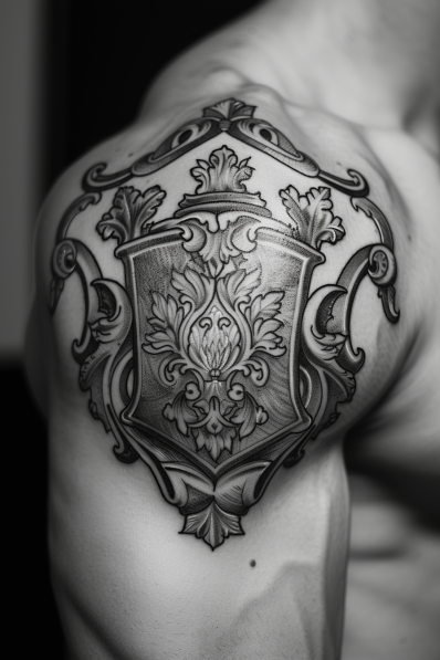 This tattoo features an elaborate and intricately engraved coat of arms, showcasing detailed floral patterns and bold ornamental scrollwork. The regal design evokes a sense of nobility, with its symmetrical lines and intricate shading giving it a carved, three-dimensional effect. The coat of arms feels like a timeless symbol of heritage, as if passed down through generations of a proud lineage. The engraving technique gives the entire piece a vintage, almost antique look, making it both sophisticated and powerful.