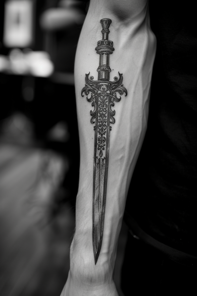 This tattoo showcases an exquisitely detailed dagger with ornate engravings running along the hilt and crossguard. The blade itself is straight and sharp, but what really catches the eye are the decorative patterns that give it a regal, almost antique vibe. The shading work adds a realistic touch, making the dagger appear as if it s ready to be pulled straight from the skin. The craftsmanship behind this piece brings out a sense of elegance and danger in one beautifully balanced design.