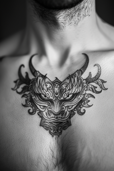 This bold tattoo features a detailed Oni mask, designed in an engraving style that highlights its fierce expression and intricate curves. The horns, sharp eyes, and swirling patterns surrounding the mask give it a dynamic and powerful look. The engraving technique brings out the mask s textures and depth, making the tattoo feel almost like it s carved into the skin. The symmetrical design adds balance, enhancing the intensity of the mask s menacing, yet captivating, face.