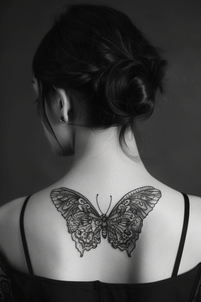 This beautiful back tattoo features an intricately engraved butterfly, spreading its wings with finely detailed patterns that give the design a lace-like appearance. The symmetrical wings are filled with ornamental swirls and filigree, adding a touch of elegance and grace to the tattoo. The placement on the upper back allows the butterfly to sit naturally between the shoulder blades, as if it s resting there, ready to take flight. The subtle shading enhances the delicacy of the design, making the butterfly feel almost weightless on the skin.