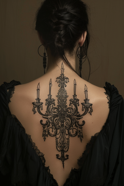 This stunning tattoo features an elaborately detailed chandelier, beautifully engraved across the upper back. The chandelier s intricate curves, elegant flourishes, and delicate candles create a regal and vintage look, as if it s hanging in an old, grand ballroom. The fine linework captures every detail, from the ornate base to the glowing candles at the top, giving the tattoo a mesmerizing three-dimensional effect. The placement perfectly complements the natural shape of the back, making the design feel as if it s part of the wearer s body.