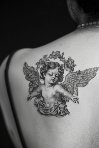 I love how this tattoo channels that old-world charm while still feeling timeless. The cherub symbolizes protection, purity, and love, making this not only a stunning design but also one with deep meaning. The engraving style gives it that historical, almost divine feel, like something you d find in an ancient cathedral or a classic art piece. It s soft, serene, and elegant, but it still makes a statement. This is the perfect tattoo for anyone who wants a piece that carries both beauty and a touch of the divine.
