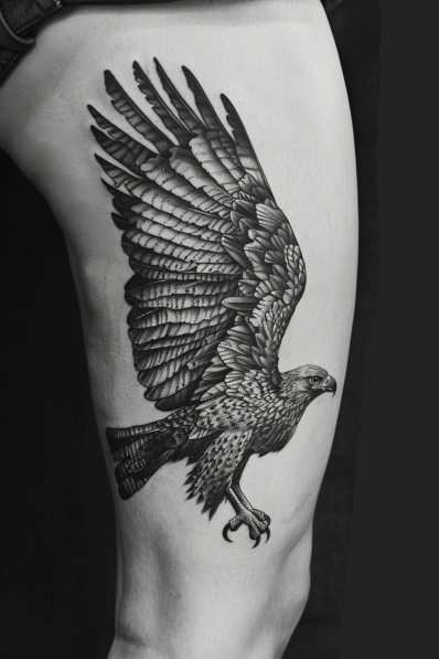 This tattoo showcases a majestic eagle mid-flight, with wings spread wide and talons ready to strike, all rendered in a detailed engraving style. The fine linework brings out the intricate feather patterns, giving the eagle a lifelike texture and depth. The shading adds a sense of movement, making the eagle appear as if it s soaring right off the skin. The sharpness of the beak and the precision of the claws capture the power and grace of this magnificent bird.