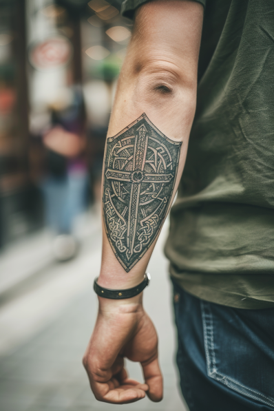 This forearm tattoo showcases a striking Viking-style shield with a sword running vertically down the center, all done in a detailed engraving style. The design incorporates intricate Nordic patterns and runes along the shield, giving it a historic and warrior-like feel. The shading and texture bring depth to the piece, making it look as though the shield could be plucked right off the skin and used in battle. The sword, with its finely crafted hilt, adds to the sense of power and protection that this tattoo represents.
