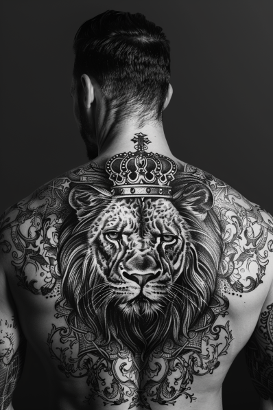 This breathtaking tattoo showcases a fierce lion s head adorned with a majestic crown, executed in a stunning engraving style. The lion s mane is intricately detailed, flowing outward with a mix of bold lines and delicate shading, while the crown on top adds an air of royalty and power. Surrounding the lion are ornate filigree patterns, which enhance the regal theme and give the entire back piece a sense of grandeur. The symmetry and craftsmanship make it a true masterpiece, covering the upper back with commanding presence.