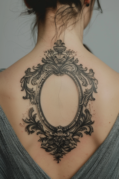 This stunning tattoo features an intricately detailed Victorian-style mirror, beautifully engraved with swirling, ornamental designs that reflect the elegance of a bygone era. The oval shape of the mirror sits perfectly in the center of the back, framed by delicate flourishes that give it an antique, almost regal feel. The craftsmanship of the line work and shading makes it look as though the mirror could catch a reflection at any moment, though the glass remains empty a powerful statement of mystery or self-reflection.