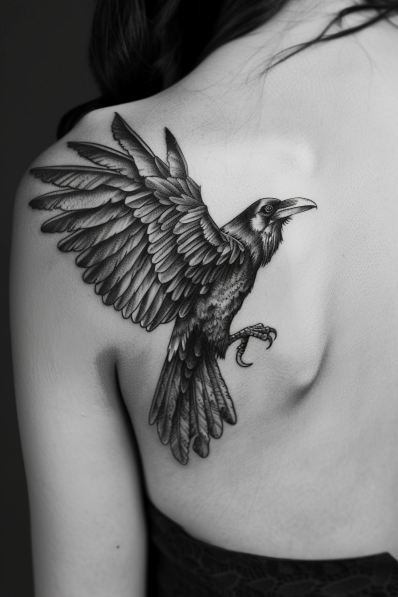 This beautifully detailed tattoo captures the dynamic image of a raven mid-flight, with wings outstretched across the upper back. The engraving-style design uses intricate linework to bring the bird s feathers to life, giving the tattoo a sense of movement and realism. The shading work is spot-on, creating depth in the wings and body, making the raven seem as though it s about to soar off the skin. The positioning on the shoulder blade enhances the illusion of flight, as if the bird is hovering just above the wearer s back.
