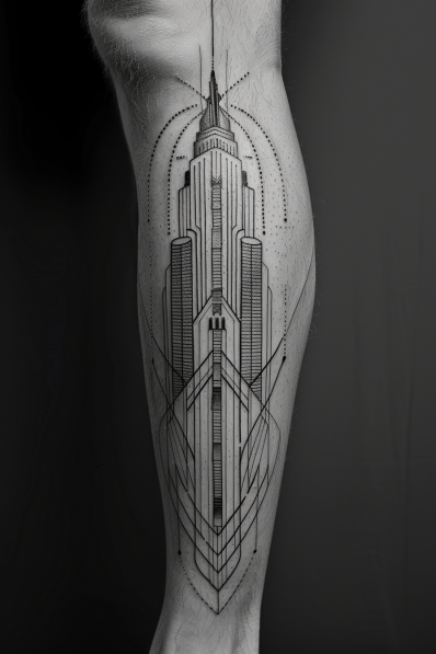 This sleek tattoo features an impressive Art Deco-style skyscraper, rendered with sharp, clean lines in a geometric engraving style. The design captures the towering grandeur of a classic cityscape, with precise angles and symmetrical details that give the building a sense of depth and structure. The dotted lines around the tower add a modern flair, emphasizing the height and giving the tattoo a dynamic, almost futuristic vibe. The placement on the leg complements the vertical design, making the building appear as though it s stretching endlessly upward.