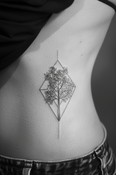 This side tattoo features a beautifully minimalist tree enclosed within a geometric diamond shape, engraved with fine lines and intricate details. The branches of the tree stretch upwards, filled with delicate leaves, while the roots are subtly hinted at below. The combination of organic and geometric elements gives the design a unique, modern look. The vertical dotted line that runs through the center adds balance and symmetry, tying the entire piece together in an understated yet captivating way.
