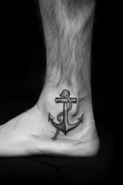 This ankle tattoo showcases a classic anchor with an intricately detailed rope wrapping around it in a beautifully engraved style. The precision in the linework gives the tattoo an almost 3D effect, making the anchor seem like it s etched right into the skin. The small but bold design fits perfectly on the ankle, a subtle reminder of stability and strength. The shading adds depth, giving the anchor a worn, vintage look like it s been through its fair share of adventures at sea.