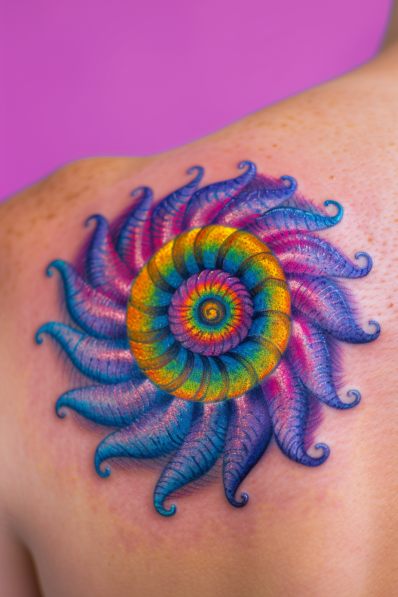 This vibrant tattoo explodes with color and creativity, featuring a hypnotic spiral at the center transitioning through a rainbow of hues. Surrounding the spiral are radiating petal-like shapes in rich purples and blues, creating an otherworldly sunburst effect. The bold colors and intricate texture make this design a true work of art, perfect for anyone embracing their inner free spirit.