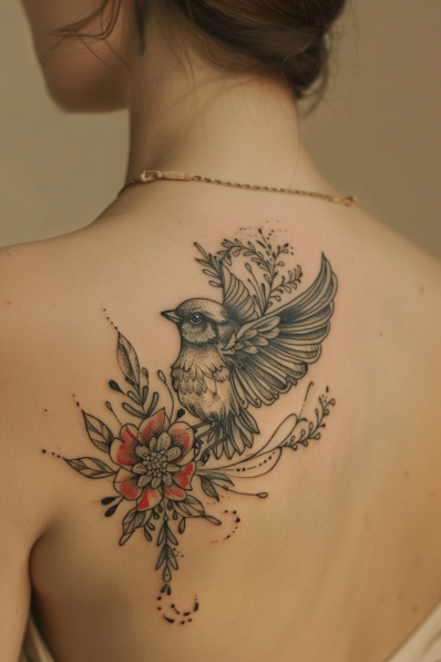 This tattoo features a graceful bird in mid-flight, its detailed feathers softly spread, surrounded by elegant floral elements. The intricate black and gray shading is complemented by a single vibrant flower in red, adding a subtle pop of color to the design. With its mix of nature-inspired elements, this piece evokes a sense of freedom and beauty.