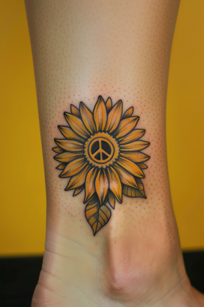 This tattoo showcases a bold and cheerful sunflower with a peace symbol nestled perfectly at its center. The petals are vibrant shades of golden yellow, while the shading and texture bring a lifelike depth to the design. A single leaf adds balance to the piece, giving it a natural and harmonious flow. The combination of the sunflower s brightness and the peace symbol makes this design radiate positivity.