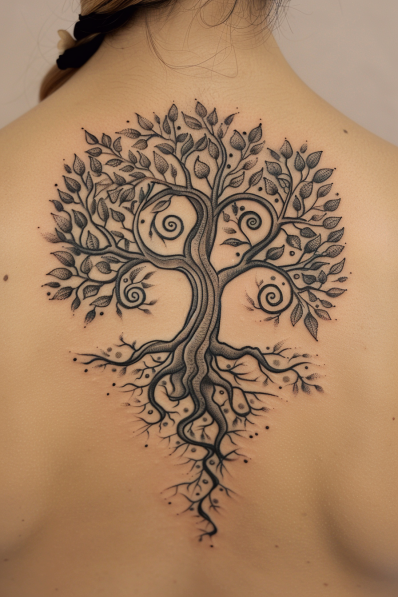 I absolutely adore this tattoo for its depth and meaning it s the ultimate representation of connection, strength, and balance. The way the roots and branches intertwine feels so symbolic of how life weaves everything together. Plus, those swirls add such a unique, whimsical touch it s like the tree has its own personality! This tattoo isn t just a piece of art; it s a powerful reminder of growth and resilience. Truly a masterpiece for anyone who loves meaningful, nature-inspired designs!