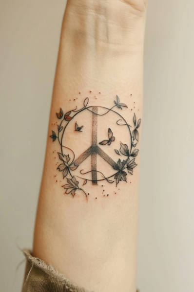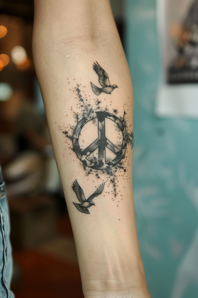 This tattoo features a classic peace symbol surrounded by a soft, splattered background that adds texture and depth. Two doves gracefully fly around the design, symbolizing freedom and harmony. The fine black ink and delicate details create a timeless and balanced look.