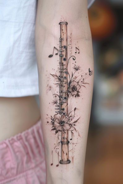 Artistic Flute and Floral Tattoo