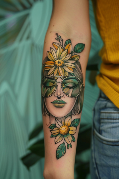 This vibrant tattoo features a serene woman adorned with oversized sunglasses, bold green lipstick, and radiant sunflowers crowning her head and cascading below her face. The vivid yellow petals and lush green leaves contrast beautifully against her calm expression, giving off major hippie queen vibes. The shading and details on the sunglasses, reflecting light, add a touch of realism that makes the piece pop.