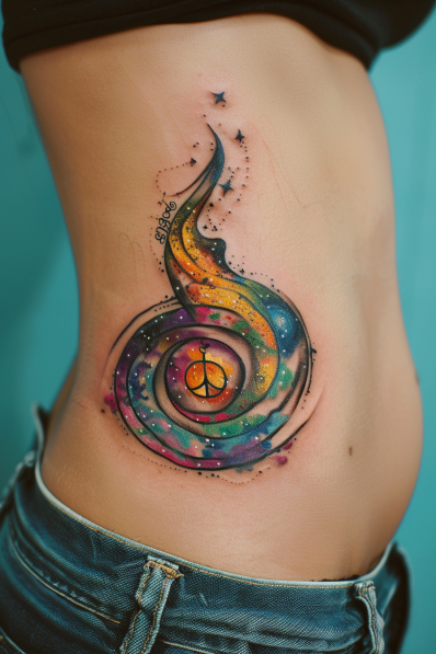 I m absolutely in love with this tattoo it s like looking into a mini-universe of positivity! The way the peace symbol anchors the swirling colors gives it a deep, grounding message of harmony amidst the chaos of the cosmos. It s bold, mesmerizing, and undeniably hippie in the best way possible. If you re into spacey vibes and want something that stands out, this tattoo feels like a wearable celebration of peace, love, and infinite possibilities. Total cosmic masterpiece!