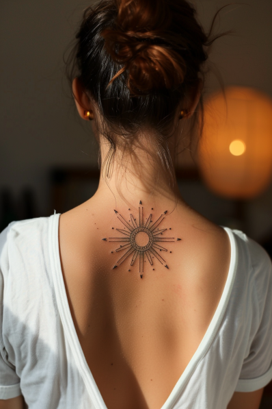 I think this tattoo is absolutely stunning because of its simplicity. It s the kind of piece that says a lot without shouting like the calm, confident friend in your group. The fine lines and geometric details make it super modern while still feeling timeless. Plus, the sunburst imagery adds a touch of optimism and light. Honestly, this is one of those tattoos that s both classy and meaningful a total win in my book!