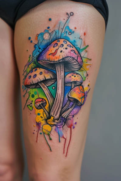 This tattoo features a vibrant cluster of mushrooms, each with colorful caps speckled in bright hues of orange, purple, and blue. The design bursts with energy, thanks to a dynamic watercolor background that splashes and drips in a rainbow of colors. The fine black ink outlines add contrast and definition, giving the mushrooms a surreal yet natural look.