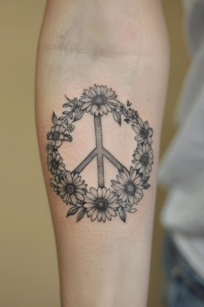 This tattoo elegantly combines a classic peace symbol with a beautifully detailed floral wreath. The design features delicate daisies and other wildflowers arranged in a perfect circle around the peace sign, all rendered in clean black and gray ink. It s the perfect mix of bold simplicity and intricate detail, making a timeless and meaningful piece.
