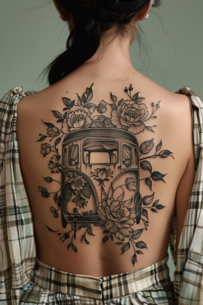 This tattoo features a beautifully detailed vintage camper van, surrounded by a lush arrangement of blooming flowers and leaves. The intricate black and gray shading gives the design a classic, timeless feel, while the floral elements soften the overall look, adding a touch of elegance and whimsy. The combination of travel nostalgia and natural beauty makes this design truly unique.
