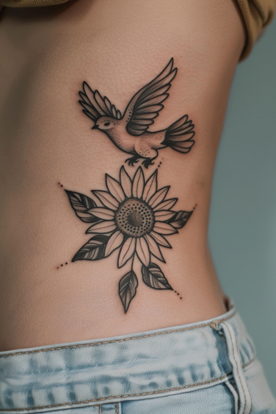 I think this tattoo is a perfect mix of meaningful simplicity and striking design. The sunflower radiates positivity and warmth, while the bird adds a sense of movement and liberation. Together, they create a design that feels hopeful and inspiring like a reminder to stay grounded while reaching for the skies. It s understated yet deeply symbolic, making it a beautiful choice for someone who values nature and freedom. A real feel-good piece!
