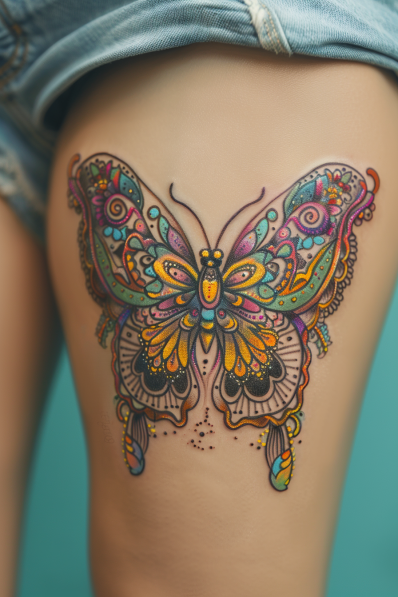 This breathtaking tattoo showcases a psychedelic butterfly with intricate patterns and vibrant colors that seem to pop right off the skin. The wings are a kaleidoscope of swirling designs in shades of gold, teal, pink, and purple, each section brimming with tiny details like dots, curls, and delicate flourishes. The symmetry and blend of bold hues create an eye-catching masterpiece.