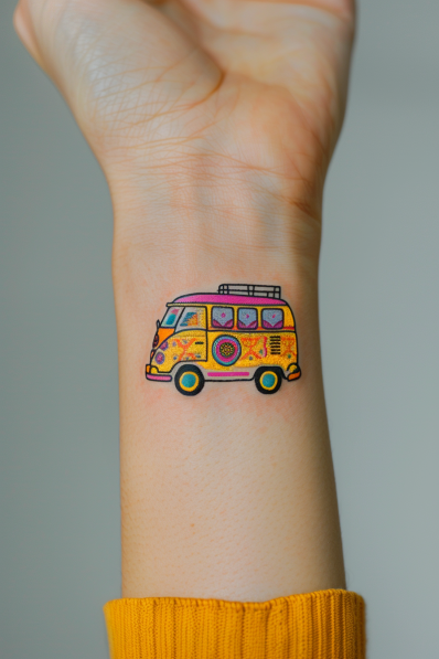 This vibrant tattoo features a classic retro hippie van, decked out in bright yellows, pinks, and purples. The van is covered in intricate floral patterns, peace signs, and other iconic 70s symbols, making it a cheerful nod to the free-spirited hippie lifestyle. Placed on the wrist, this small but bold design pops with color and personality, perfect for someone who loves vintage vibes and sunny road trip dreams.