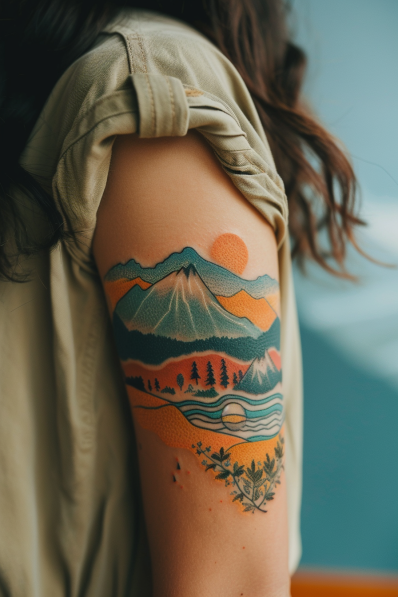 I absolutely love this tattoo for its dreamy, nature-inspired aesthetic. It feels like a postcard from your favorite camping trip or a tribute to the beauty of the great outdoors. The layered colors and clean lines create a stunning visual effect, making it both artistic and meaningful. If you re someone who finds peace in nature or wants a constant reminder of your favorite escape, this design is like carrying a little piece of the wilderness with you every day. Truly inspiring!