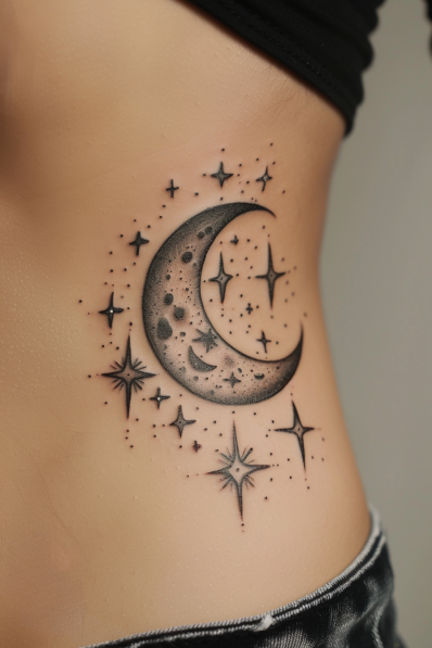 I think this tattoo is out of this world literally! It s such a peaceful and whimsical design that instantly makes you think of stargazing on a clear night. The subtle shading on the moon is just gorgeous, and those sparkling stars are like little bursts of light bringing the whole design to life. Whether you re into astrology, the mysteries of the universe, or just love a classic celestial look, this tattoo is pure cosmic perfection!