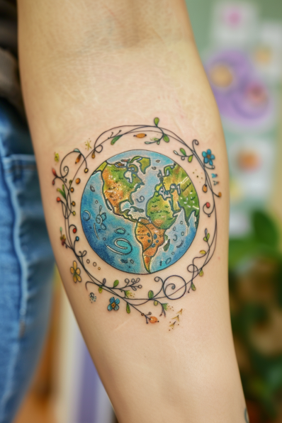 This tattoo features a colorful depiction of planet Earth surrounded by a whimsical wreath of vines, flowers, and delicate swirls. The continents are shaded in warm, earthy tones, while the oceans radiate with soft blues and greens, creating a vibrant, nature-inspired masterpiece. The floral wreath adds a playful, bohemian touch, tying the whole design together in harmony.