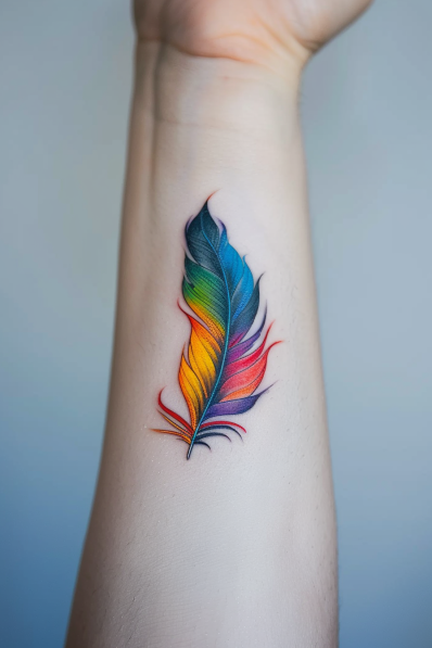 This tattoo showcases a striking feather design that transitions seamlessly through the colors of the rainbow. The gradient effect, from deep blues to fiery reds, gives the feather a vibrant and dynamic appearance, while the subtle shading and fine details in the barbs make it feel delicate and lifelike. The bold use of color contrasts beautifully with the soft, flowing shape of the feather.