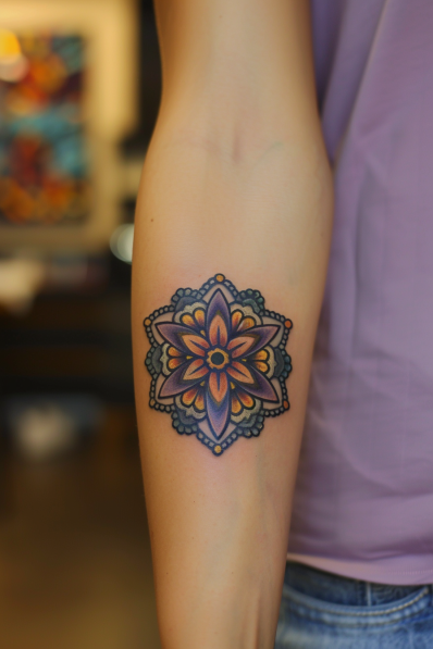 This tattoo features a stunning mandala-inspired flower design, bursting with vibrant colors like orange, purple, and gold. The intricate layering of petals creates a hypnotic, kaleidoscopic effect, while the bold outlines and delicate dot work give the piece a polished and balanced finish. The color palette and symmetry make this tattoo both eye-catching and harmonious.