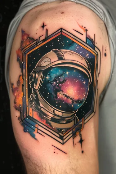 This shoulder tattoo features a sleek astronaut helmet with a galaxy swirling right where the face should be. Instead of a reflection, it s like you re peeking into a universe full of stars, nebula clouds, and dreamy purples and blues. The entire design is framed by a bold geometric hexagon that adds structure and makes the whole piece feel even more out-of-this-world. Pops of orange and pink spill around the edges like a nebula breaking through the ink.