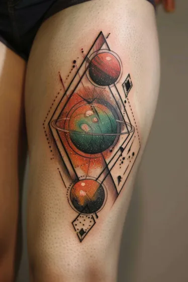 This stunning thigh tattoo features a trio of colorful planets floating inside a sharp geometric diamond frame. The planets themselves glow with deep greens, fiery oranges, and cosmic reds, giving the whole design a vivid and otherworldly vibe. Bold black lines and soft dotwork surround the orbs, with scattered stars and angular details that add extra movement and dimension. The layout flows perfectly with the curve of the thigh, and the contrast between the structured geometry and dreamy galaxy texture is just chef s kiss.