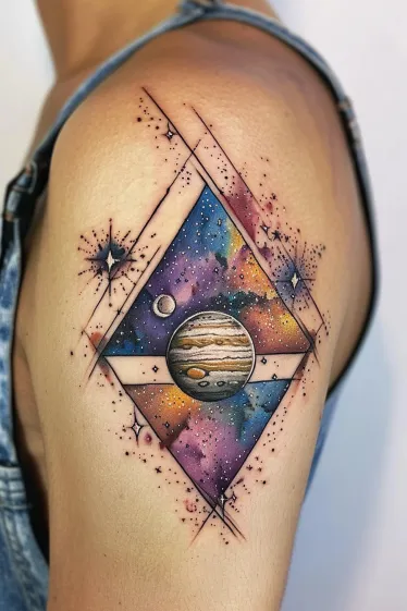 This vibrant upper arm tattoo features a striking view of Jupiter floating front and center inside a diamond-shaped frame. The planet s iconic stripes are beautifully shaded in rich earth tones, while the background bursts with cosmic watercolor magic. There are layers of dreamy purples, oranges, blues, and pinks swirling together like a nebula storm. Tiny stars and dotted details give the whole design a celestial sparkle, and the geometric lines keep everything feeling balanced and bold.