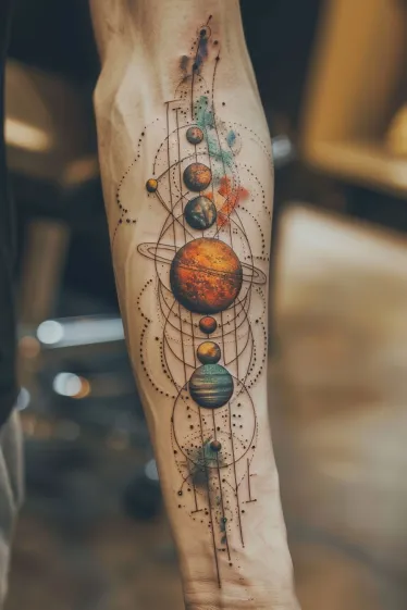 This breathtaking forearm tattoo features a full lineup of planets orbiting along a clean vertical line, accented by delicate dotwork and abstract geometry. Each planet is beautifully colored with rich textures, from fiery reds to icy blues, making the whole design feel alive with movement. Thin lines connect the orbits in elegant curves, while bursts of watercolor add just the right amount of cosmic flair. It flows perfectly down the forearm and looks like a stylish star map that belongs on your skin.