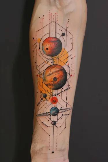 This striking forearm tattoo features a vertical alignment of richly textured planets, each wrapped in precise geometric forms that give the whole piece a futuristic vibe. The standout orange planets are full of warmth and fire, glowing against a sharp grid of hexagons, dots, and orbital lines. Soft watercolor bursts in orange and yellow create a vibrant backdrop, while the smaller blue and black planets add contrast and balance. The whole layout stretches smoothly along the forearm for maximum visual impact.