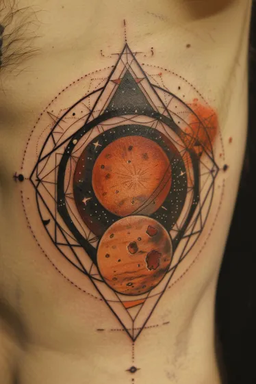 This stunning rib tattoo features two deep-orange planets layered within a web of sharp black geometric shapes and delicate dotwork. The planets look rich with texture, like Mars under a microscope, and they re surrounded by a mix of triangle outlines, orbital curves, and cosmic details that frame everything beautifully. A soft burst of rusty red adds movement behind the planets, giving the piece extra depth and a painterly feel that contrasts perfectly with the crisp geometry.