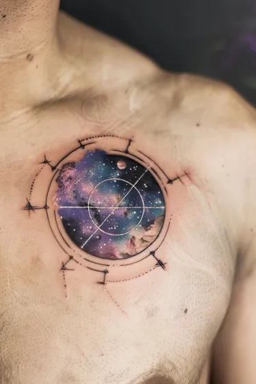 This tattoo looks like a magical window straight into another galaxy. Placed perfectly over the chest, it features a circular portal filled with dreamy purple and blue nebula clouds, tiny stars, and even a glimpse of a distant planet. The surrounding geometric detailing frames it like a cosmic compass, giving the whole piece a modern sci-fi-meets-sacred-symbol vibe. The soft colors contrast beautifully with the sharp black lines, and everything is so balanced and intentional.
