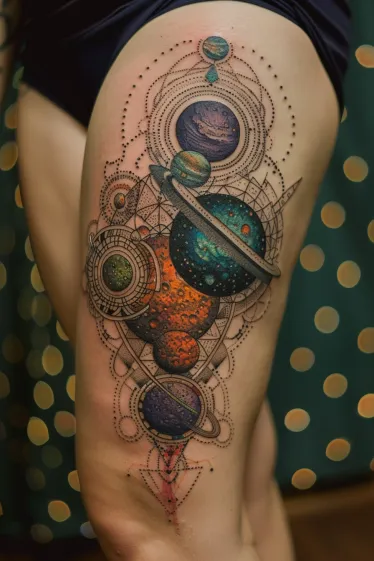Colorful Planet Cluster Thigh Tattoo