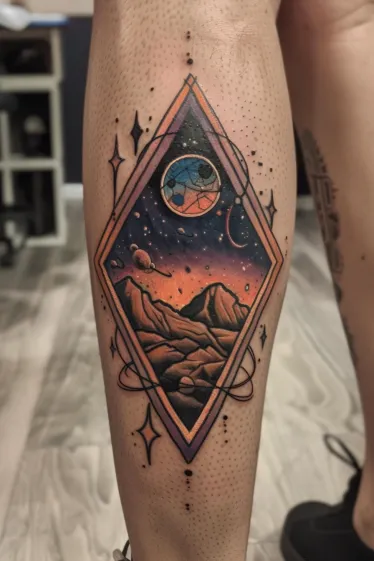 This gorgeous calf tattoo frames a surreal alien landscape inside a sharp diamond shape. Inside, a dusty, otherworldly mountain range glows under a vivid orange and purple galaxy sky. Floating planets and stars add that magical celestial touch, while a fragmented blue and red moon hovers just above the peaks. The clean geometric border gives it a sleek, sci-fi poster feel, and the added orbital lines and sparkly dots around the diamond make it feel like it s suspended in space.