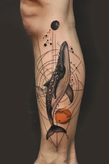 This tattoo features a majestic black and grey whale floating vertically through a space-themed backdrop, placed beautifully along the calf. Behind it, a series of geometric rings and planetary orbs guide the eye upward, with a fiery orange planet near the whale s tail and a shadowy moon near the top. The details on the whale are incredibly intricate, with subtle white speckles that make it look like it s part of the cosmos. The geometric shapes create a sense of movement that fits perfectly with the natural curve of the leg.