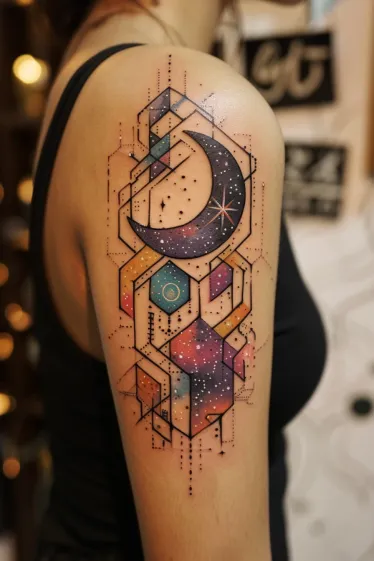 This gorgeous upper arm piece features a bold crescent moon floating in a galaxy of hexagons, stars, and colorful cosmic blocks. The shapes are perfectly stacked, almost like 3D puzzle pieces from another universe. Inside them, you ll find dreamy galaxies swirling with pinks, purples, oranges, and blues that glow like tiny universes. The clean black linework gives the whole design structure, while the stars and sparkles scattered throughout make it feel weightless and magical.