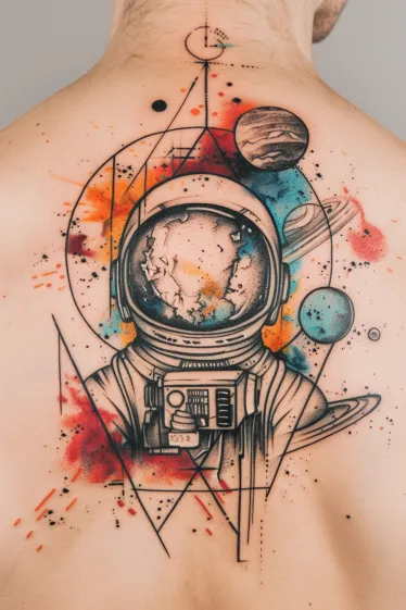 This large back piece features a lone astronaut floating in the middle of a colorful, geometric cosmos. The helmet reflects a dreamy scene that feels cracked open to another dimension. Surrounding the figure are bold planets, rings, and splashes of watercolor in fiery reds, sunny oranges, and deep blues. Clean geometric lines frame the entire design, giving it structure and contrast that really makes the whole thing pop. It s bold, modern, and beautifully spaced to flow with the shape of the back.