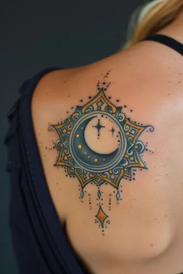 This gorgeous shoulder piece blends geometric elegance with a dreamy celestial vibe. A soft crescent moon floats inside a star-shaped mandala, complete with tiny dotted accents and delicate ornamental details. The cool greys of the moon pair beautifully with the rich gold tones in the mandala, while subtle cosmic elements like twinkling stars and hanging diamonds give it that extra sparkle. The symmetry of the design adds a touch of balance, making the whole tattoo feel like a tiny universe resting on your skin.